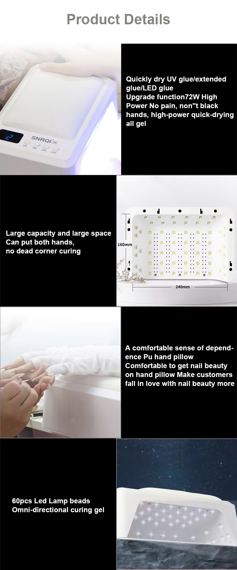 Tuote takaa tasaisen liiman kuivumisen ilman kutistumista. Sen kaksi valonlähdettä lämmittävät hellävaraisesti estämään käsien värjäytymistä ja silmien rasitusta. Soveltuu sekä käsille että jaloille, mikä takaa huomattavan nopean kuivumisen.