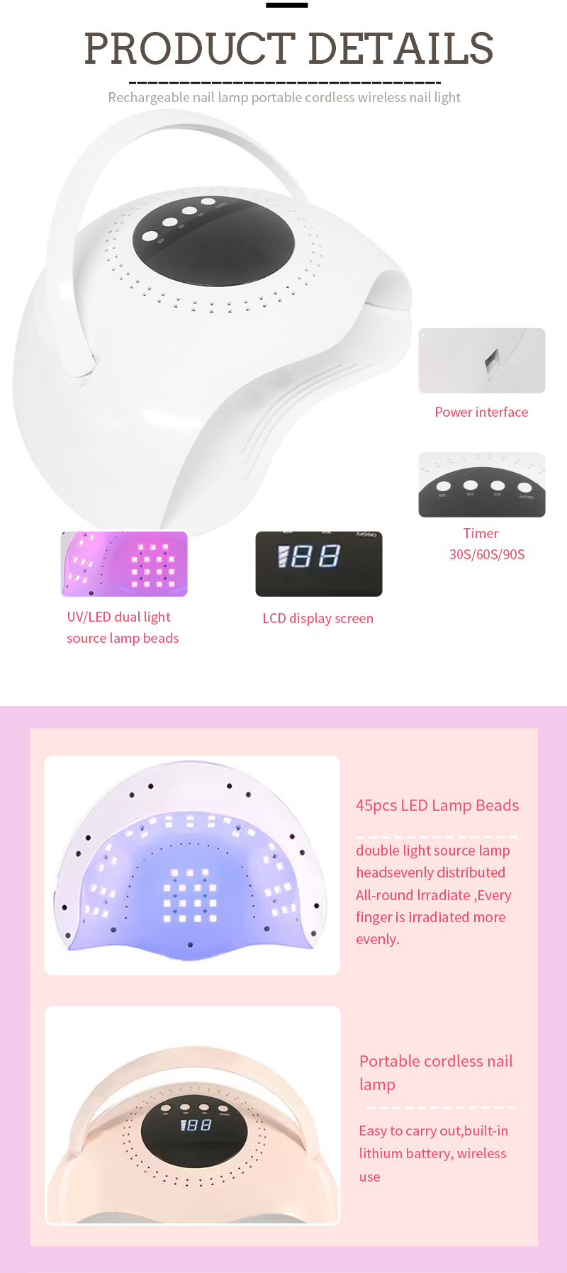 Tuote varmistaa jopa liimakuivauksen ilman kutistumista. Sen kaksoisvalonlähteet tarjoavat lempeän lämmityksen käsien värimuutoksen ja silmäjännityksen estämiseksi, sopivat molemmille käsille ja jaloille, tuottaen huomattavan nopeasti kuivaustulokset.