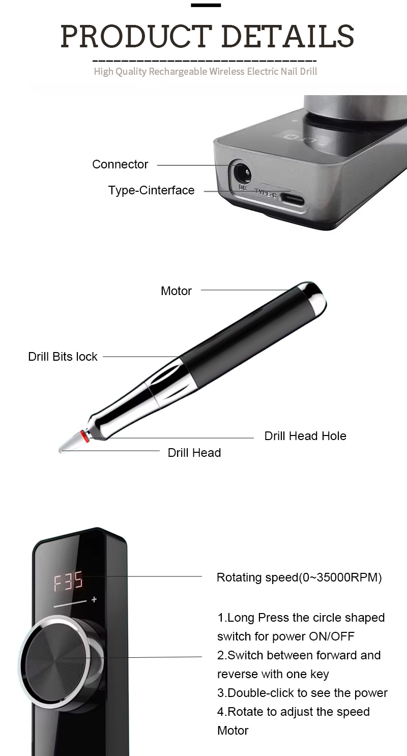 Sähköinen kynsipora, jota ei ole helppo vaurioittaa käsikappaletta 65w 35000rpm
