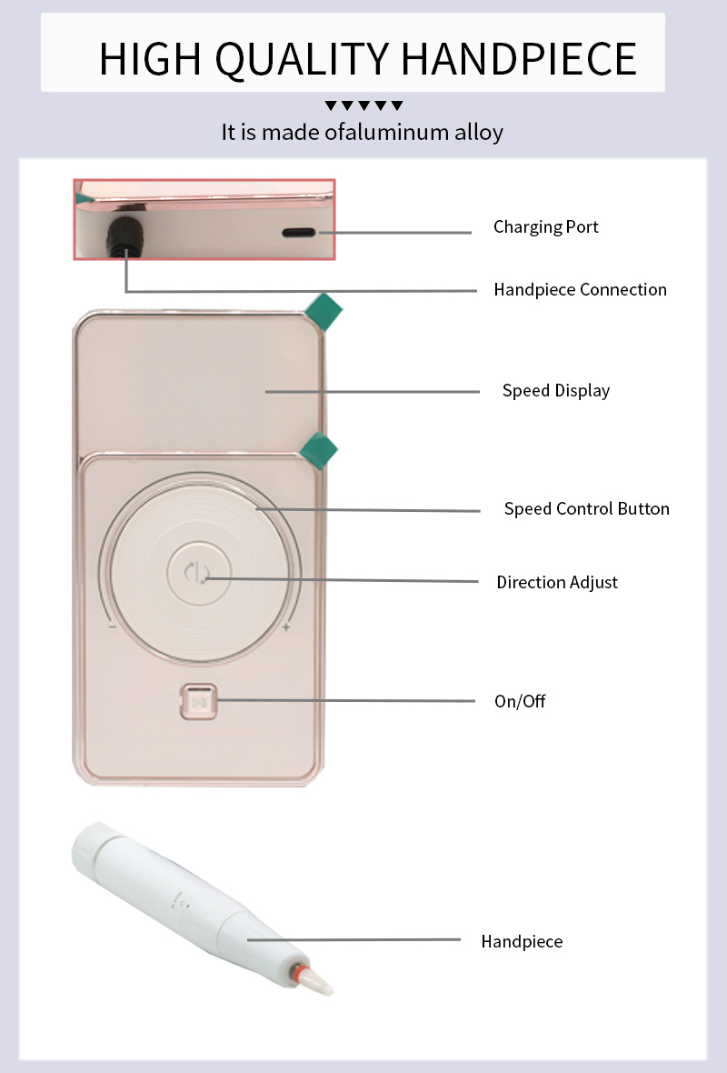 Tämä nopea ja hiljainen hiomakynänäyttö, jossa on hiomakynän kanta, LCD-nestekidenäyttö, joka voi näyttää kierrosten määrän / tehon / suunnan, nopeuskytkinnuppi, myötäpäivään / vastapäivään vaihtopainike, taukopainike, 30 000 rpm ammattimoottori, kierrettävä lukittava hiomapää.