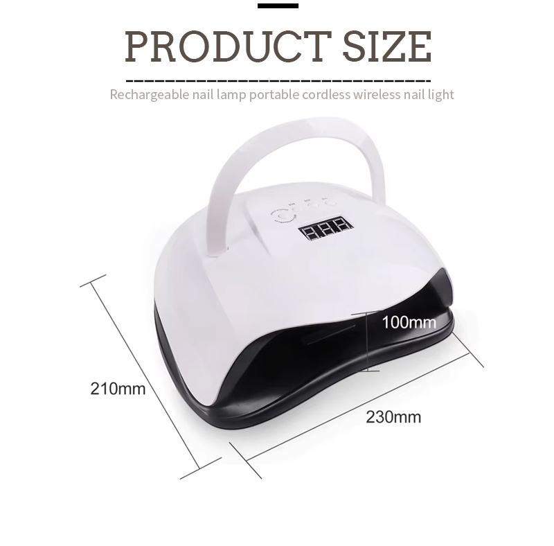 Kannettavan kynsien kuivausvalaisimen mitat ovat 180 mm pitkä, 190 mm leveä ja 85 mm korkea, ja siinä on suuri kapasiteetti ja mahdollisuus käyttää sekä käsiä että jalkoja, mikä on erittäin kätevää.