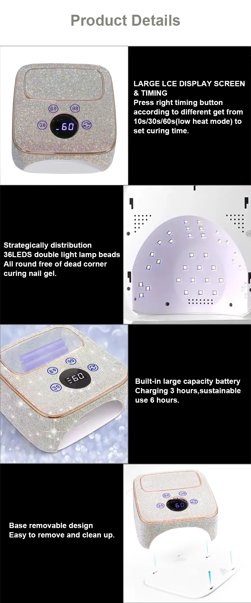 Tuote takaa tasaisen liiman kuivumisen ilman kutistumista. Sen kaksi valonlähdettä lämmittävät hellävaraisesti estämään käsien värjäytymistä ja silmien rasitusta. Soveltuu sekä käsille että jaloille, mikä takaa huomattavan nopean kuivumisen.