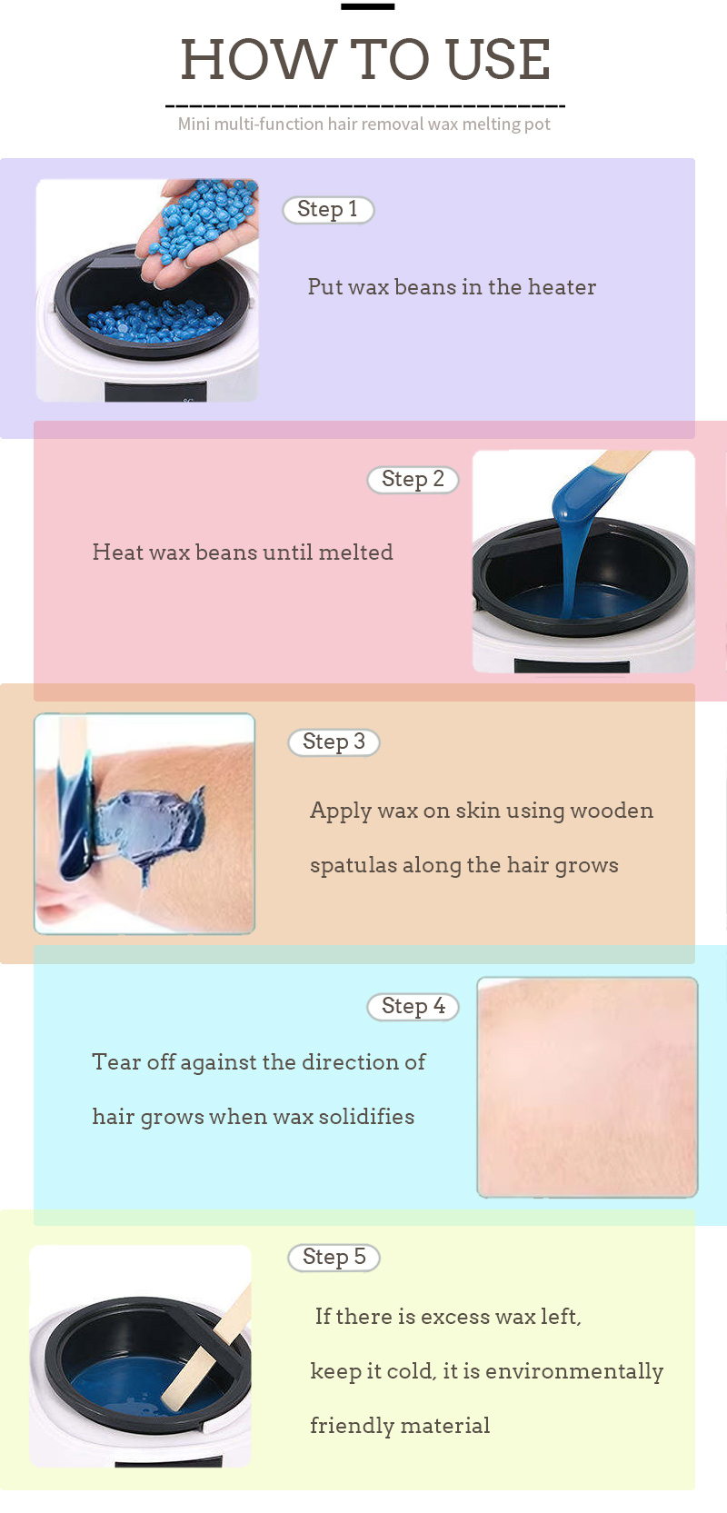 Tuotteen karvanpoistovaha toimintatapa, mitä korkeampi lämpötila, sitä nopeammin vaha sulaa, mitä alhaisempi lämpötila, sitä hitaammin vaha sulaa, kaadetaan ensin sopivaan määrään karvanpoistovahapapuja, lämmitetään kunnes vahapavut sulavat, sitten tasaisesti päällystetyn karvanpoistovahan karvanpoistoosat ja lopuksi karvojen kasvusuuntaa vastaan.
